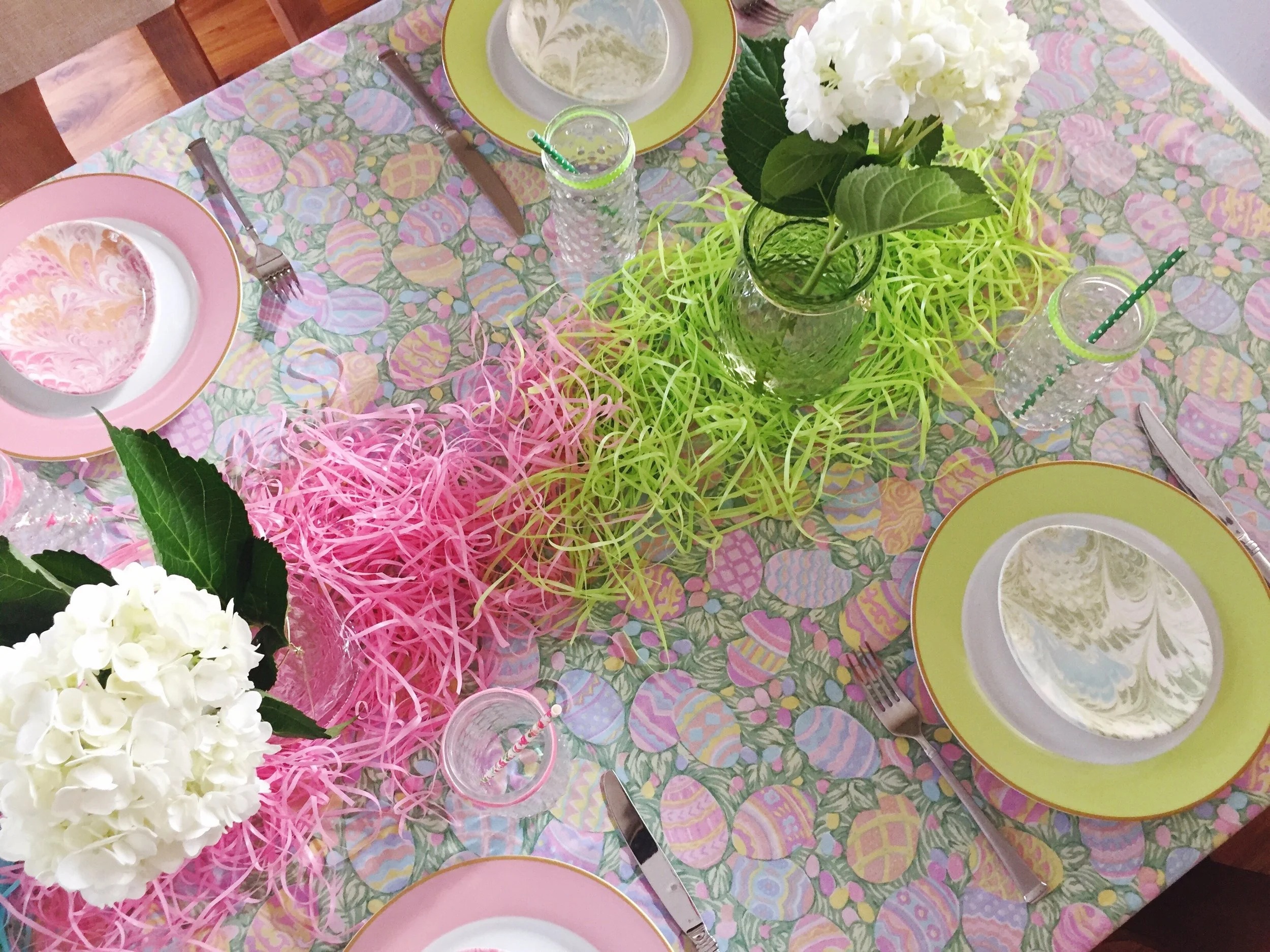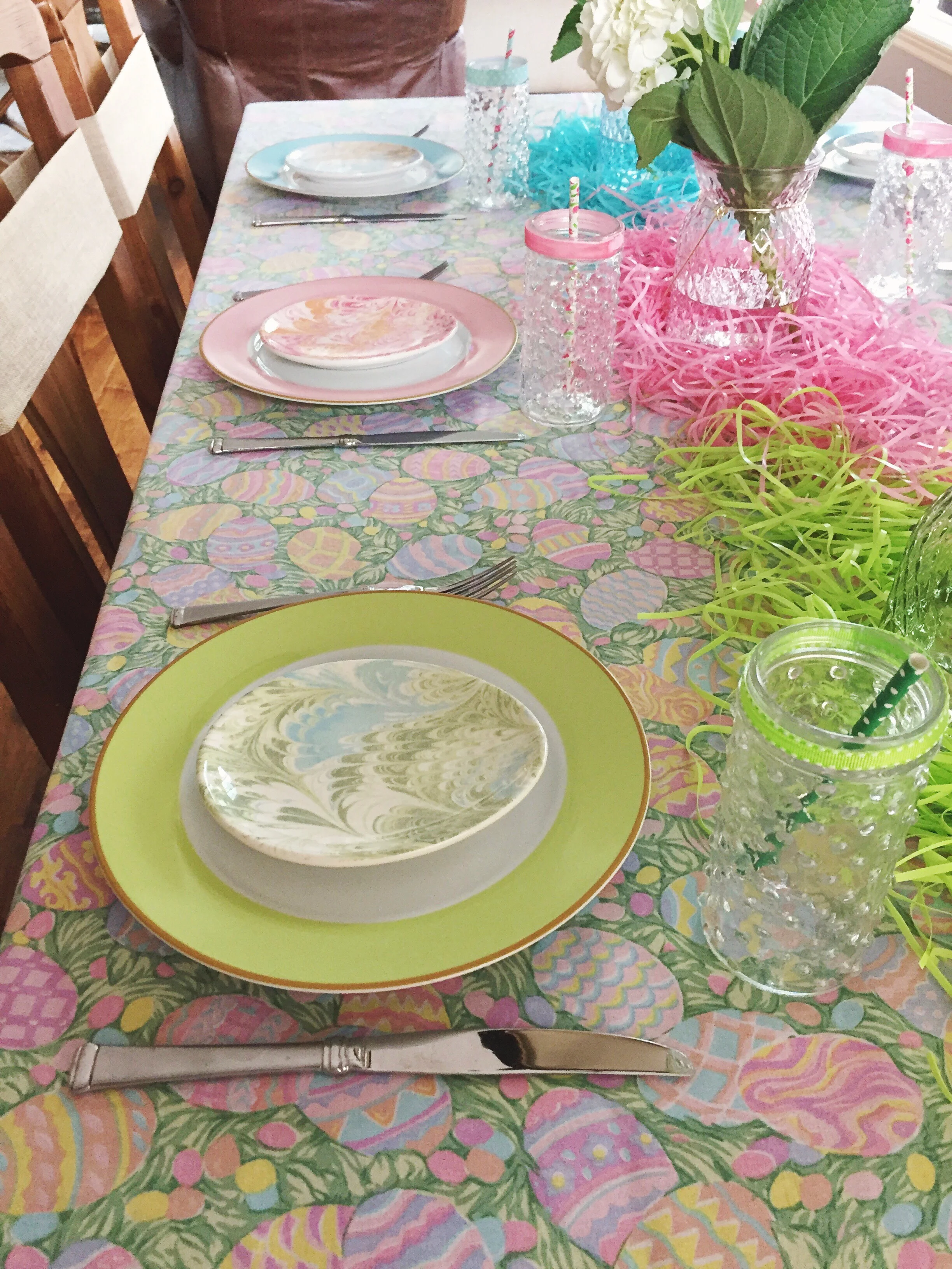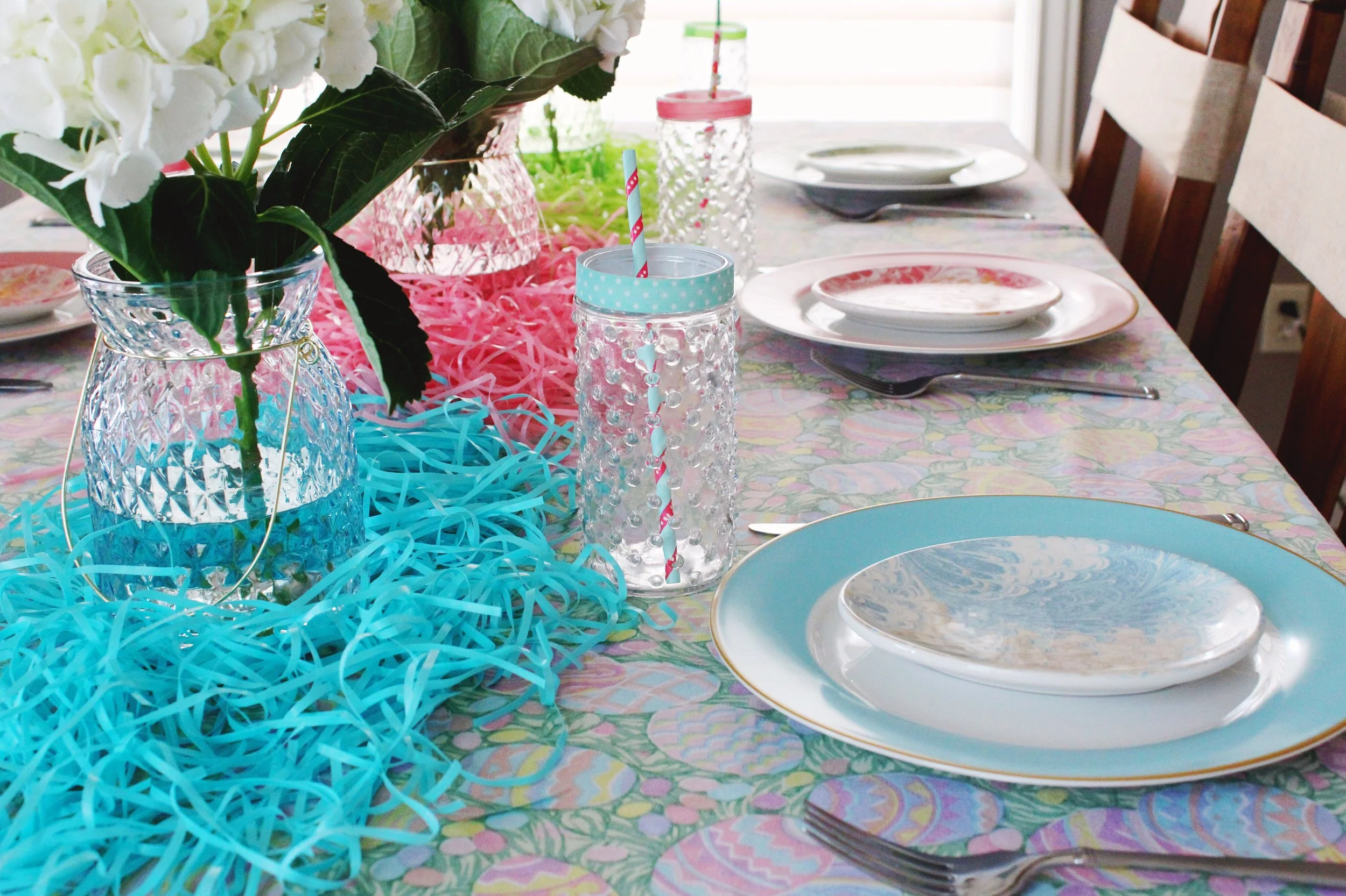 Easter grass is a fun, easy, and inexpensive way to create a runner-effect on the table and really help solidify the color palette!