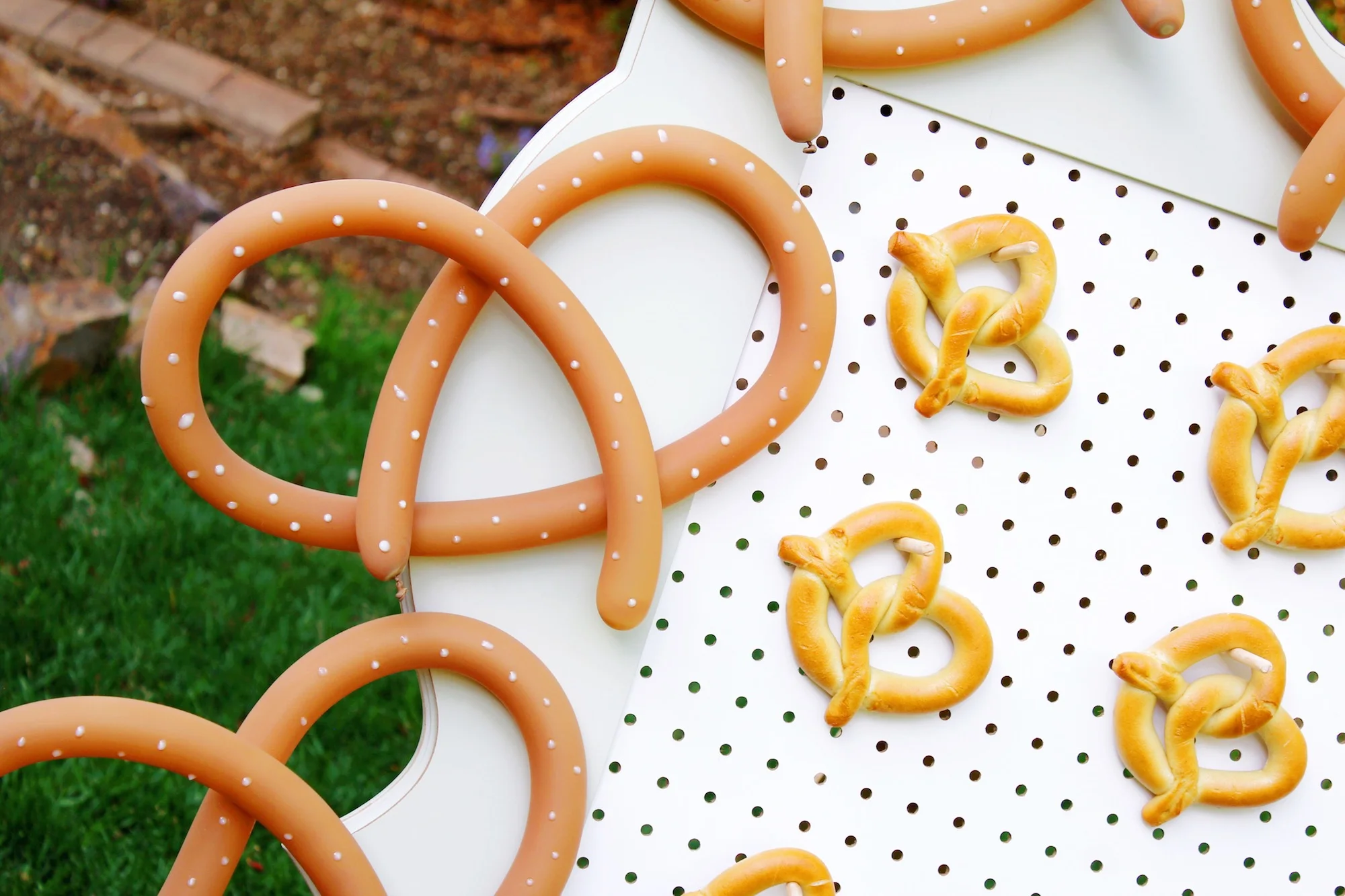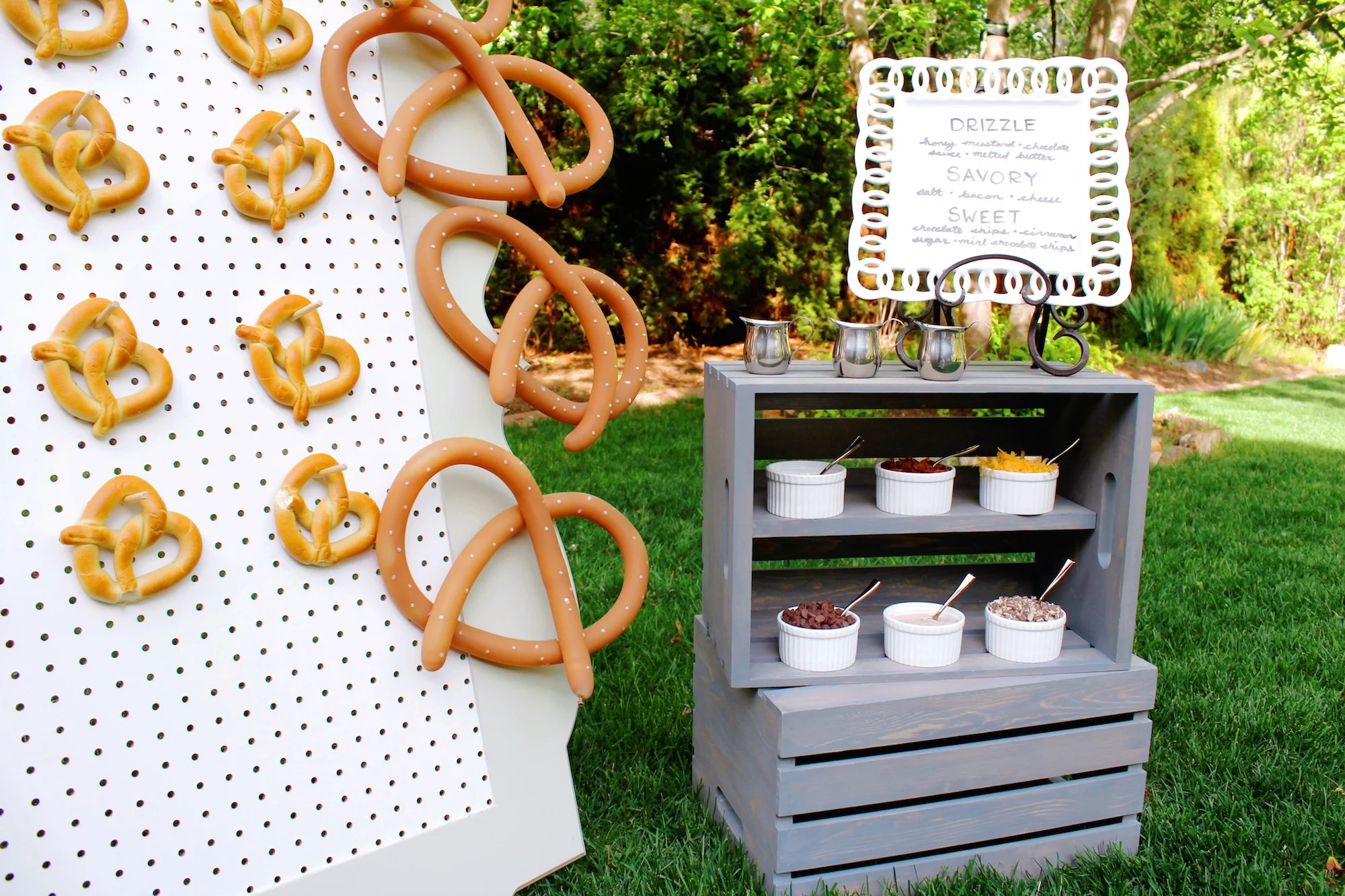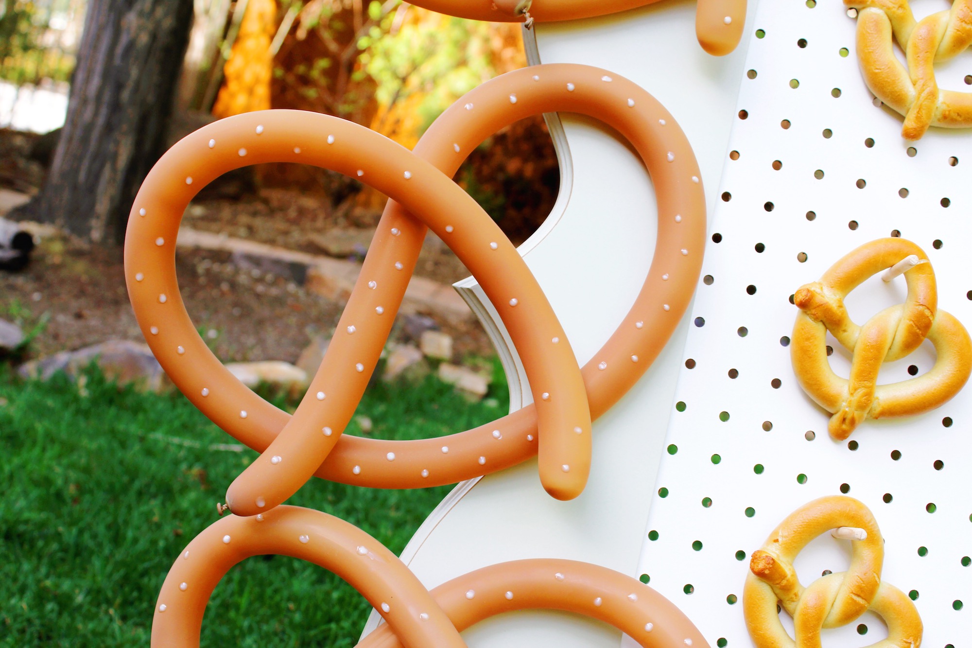 This Friday is National Pretzel Day and so of course we’re celebrating with a soft pretzel bar complete with toppings! Did you jump on the donut board craze? Well pull it back out because it works for pretzels too! We dressed our board up with the easiest DIY balloon pretzels—no twisting involved! We blew up 160Q mocha-colored balloons, attached glue dots at the center crossover and each end of the balloon (3 in total per balloon), and used puff paint for salt! We didn’t go too overboard with the toppings, but there is so much potential! We’ve got a few sweet options, a few savory, and my personal favorite was butter with cinnamon sugar—SO GOOD! Scroll on for all the details!