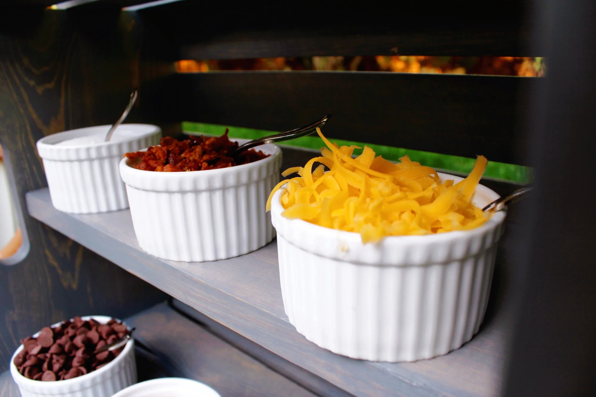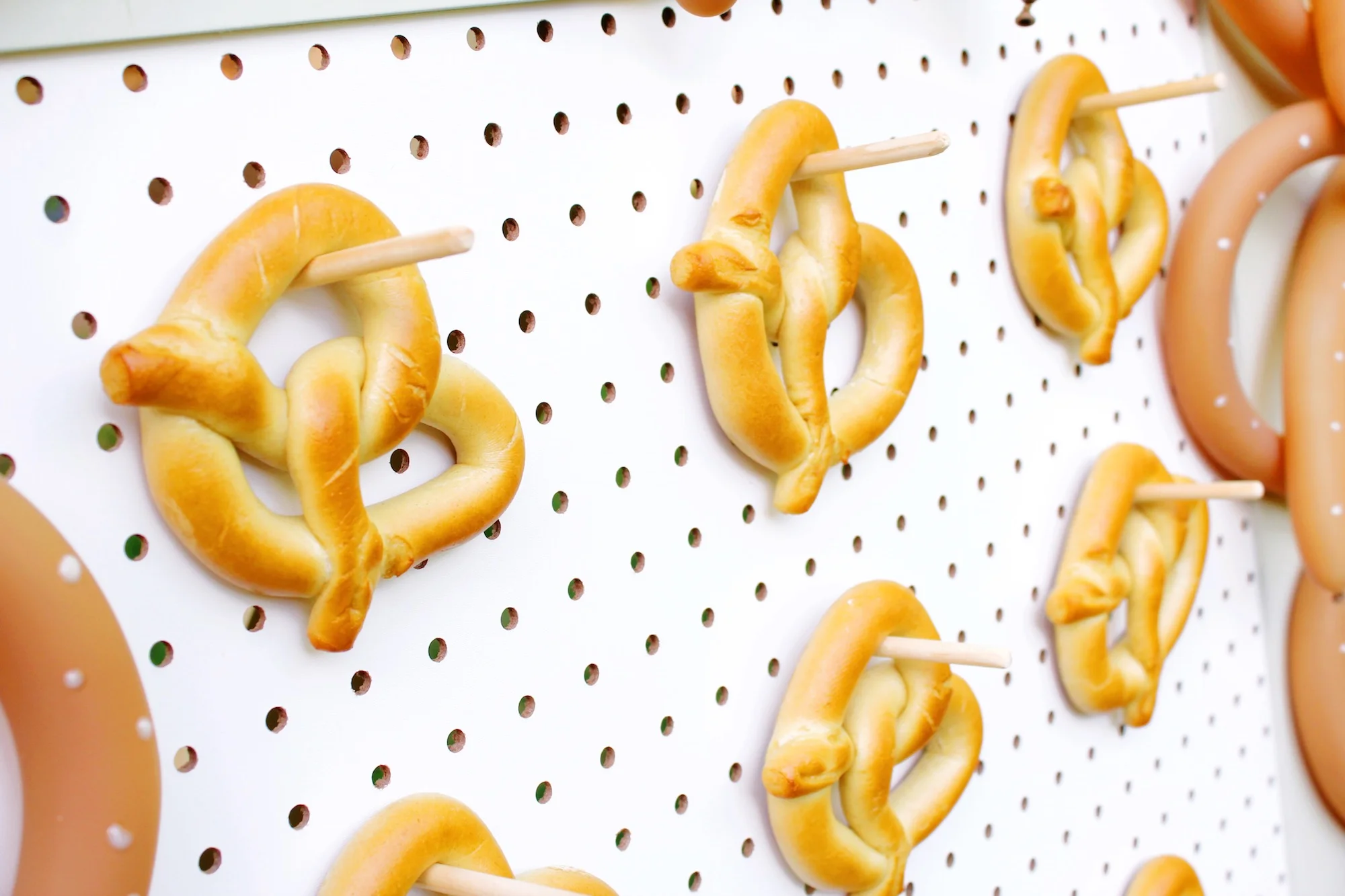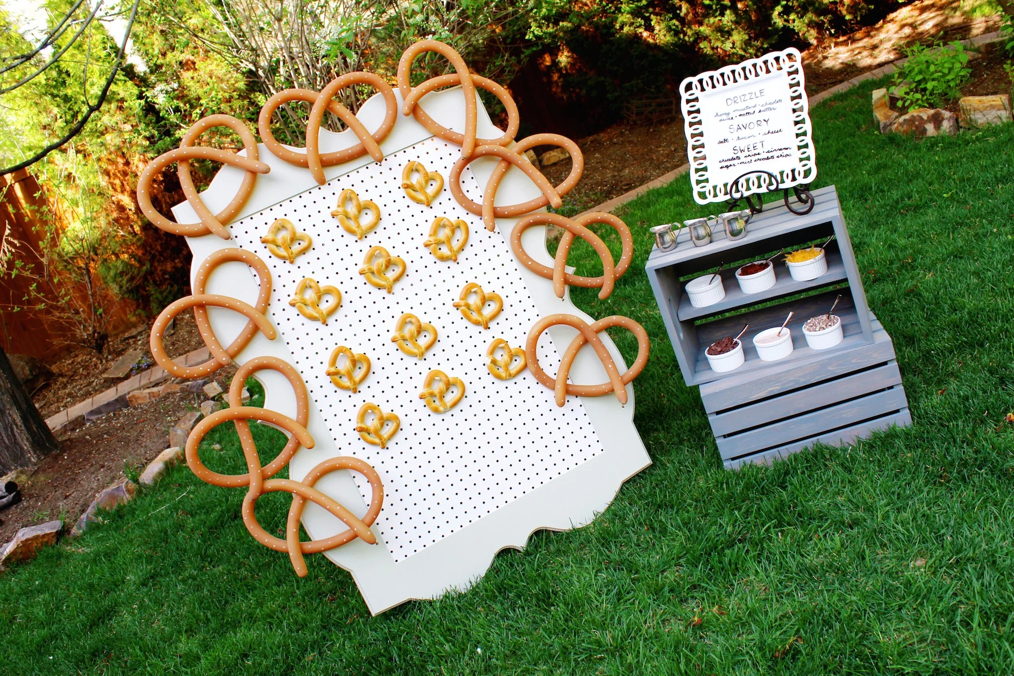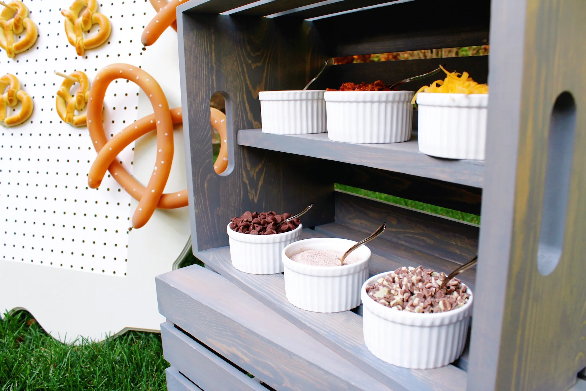 This Friday is National Pretzel Day and so of course we’re celebrating with a soft pretzel bar complete with toppings! Did you jump on the donut board craze? Well pull it back out because it works for pretzels too! We dressed our board up with the easiest DIY balloon pretzels—no twisting involved! We blew up 160Q mocha-colored balloons, attached glue dots at the center crossover and each end of the balloon (3 in total per balloon), and used puff paint for salt! We didn’t go too overboard with the toppings, but there is so much potential! We’ve got a few sweet options, a few savory, and my personal favorite was butter with cinnamon sugar—SO GOOD! Scroll on for all the details!
