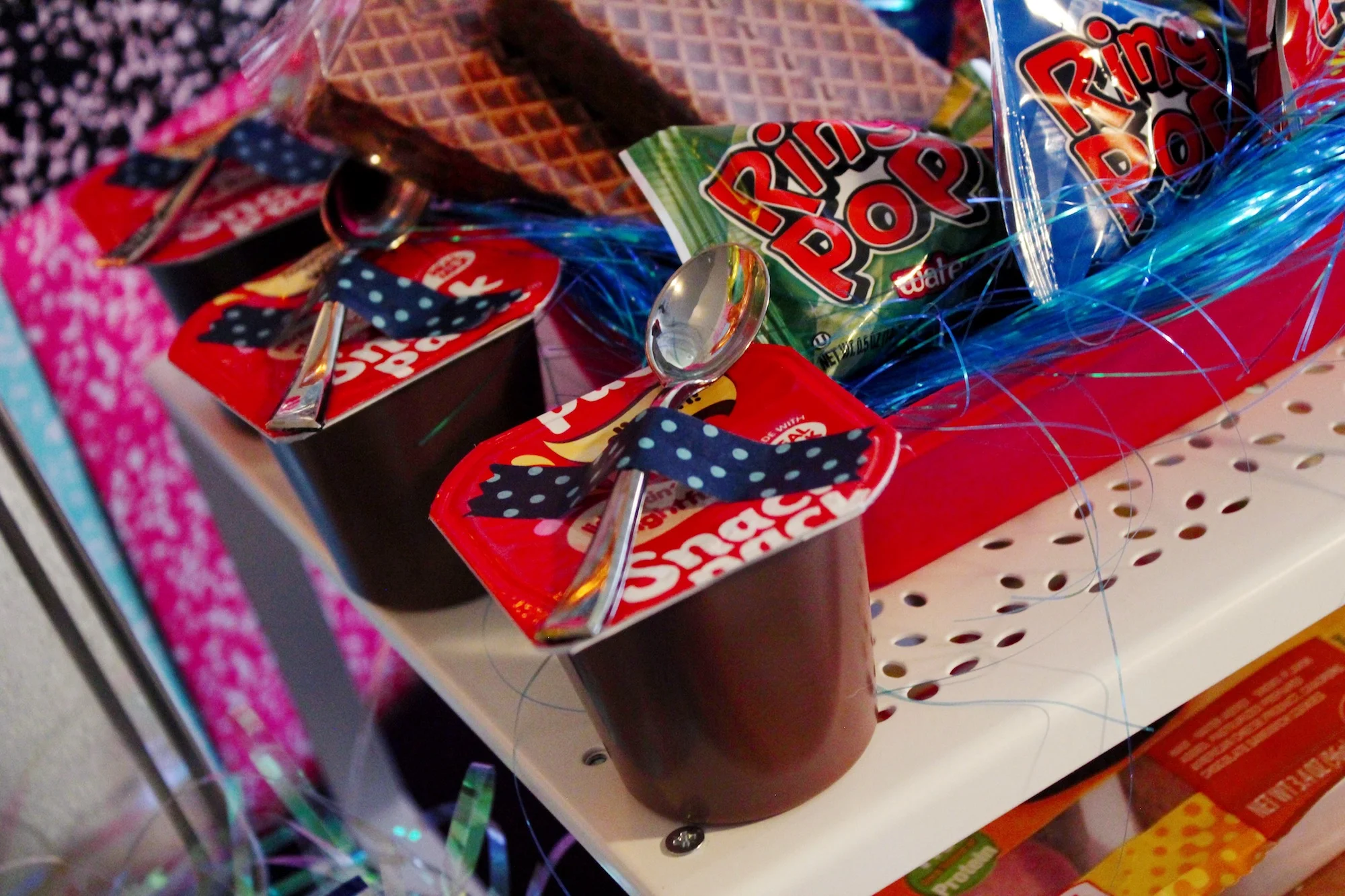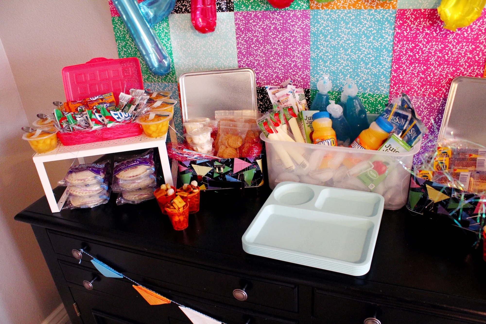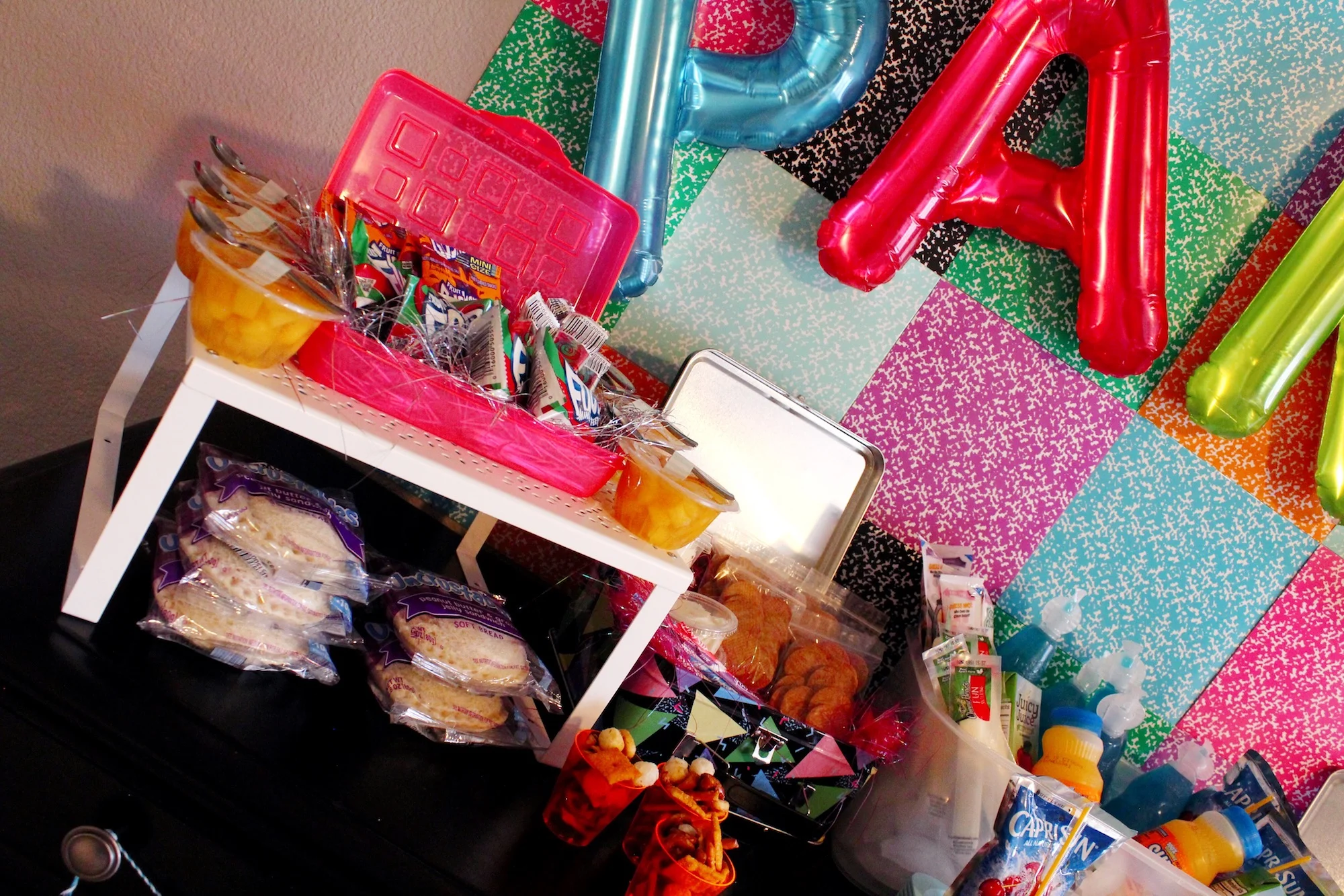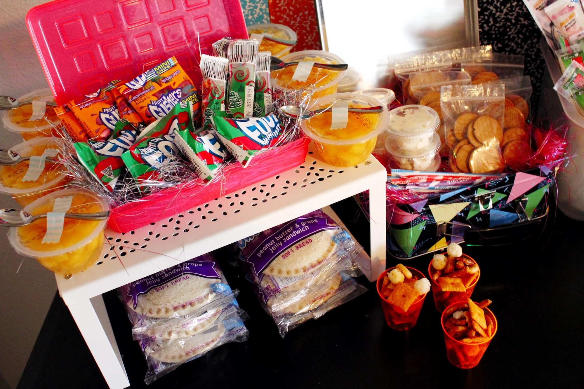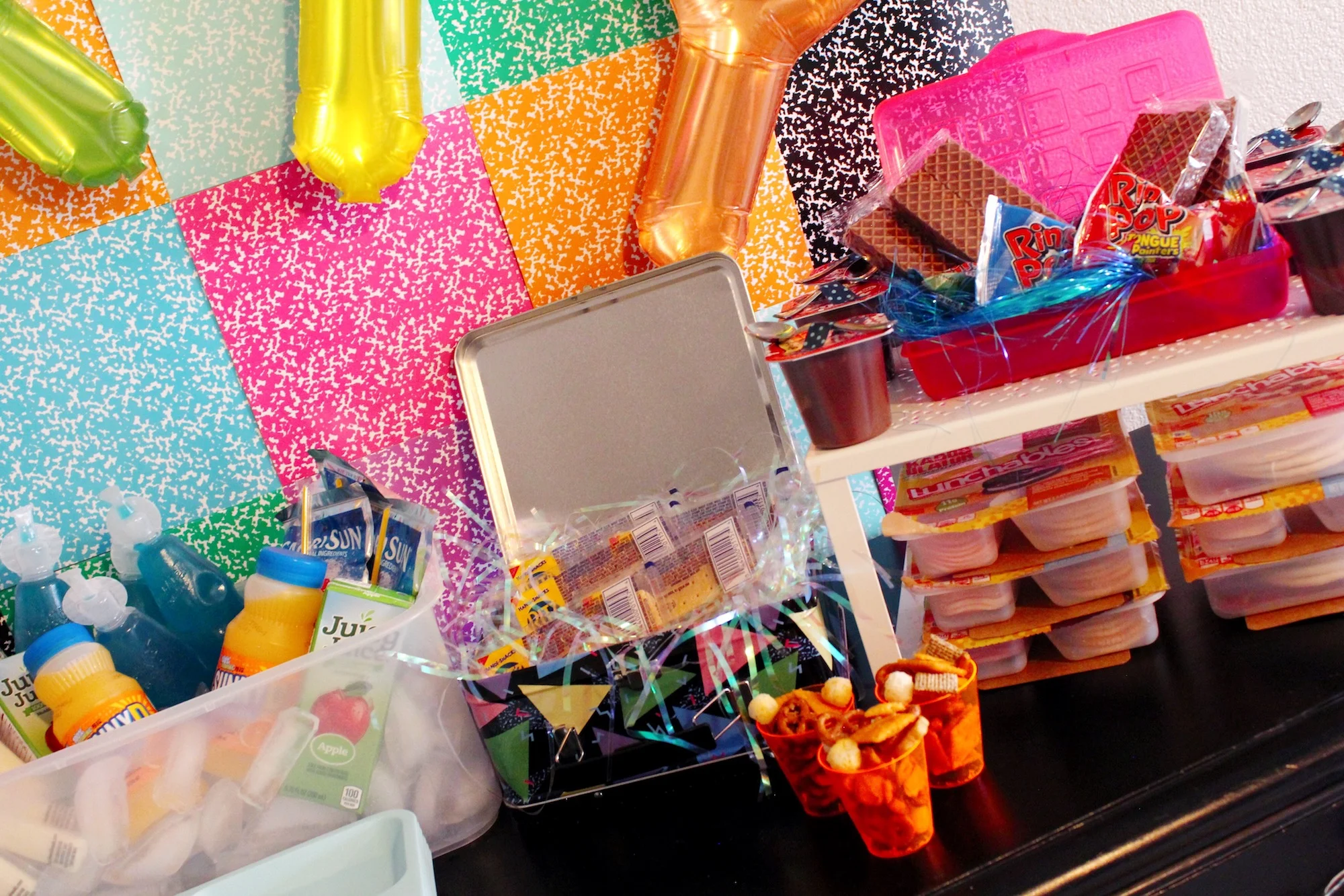 This one’s for my fellow 90s kids! When your friend tells you she wants to spend her birthday watching Hey Arnold, you channel your childhood for party foods and a school cafeteria lunch spread is born! This would also be really fun inspiration for a back-to school party! The backdrop was made out of square notebooks that look like colorful composition books. Lunchboxes and pencil boxes are perfect for keeping snacks, and did anyone else fold their notes they passed into triangles? Because that’s what the banner is! Scroll on for more colorful nostalgia and let me know in the comments if I left out one of your favorite 90s snacks!