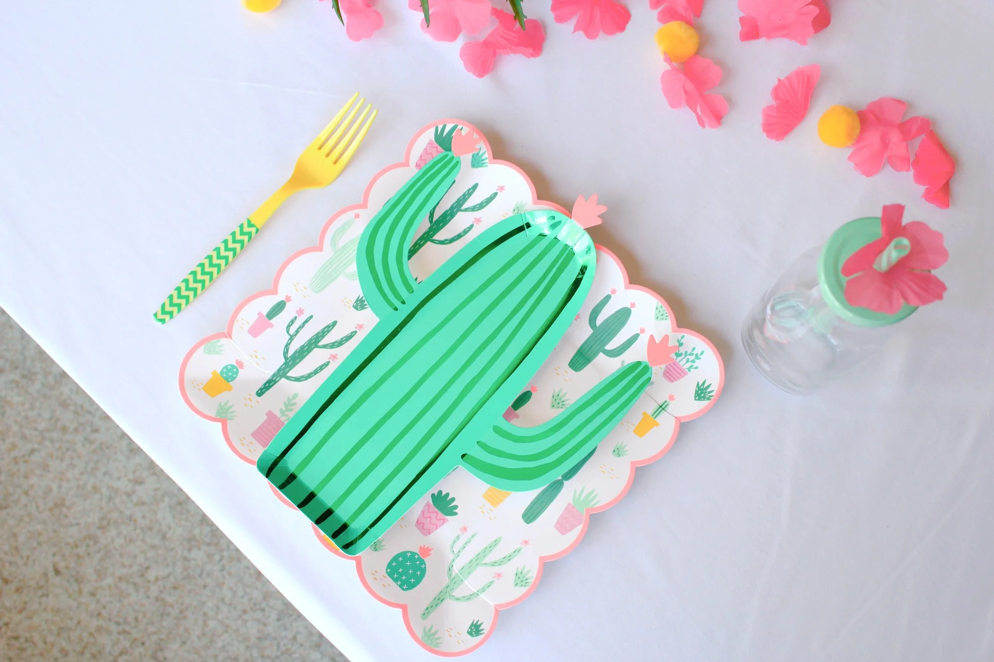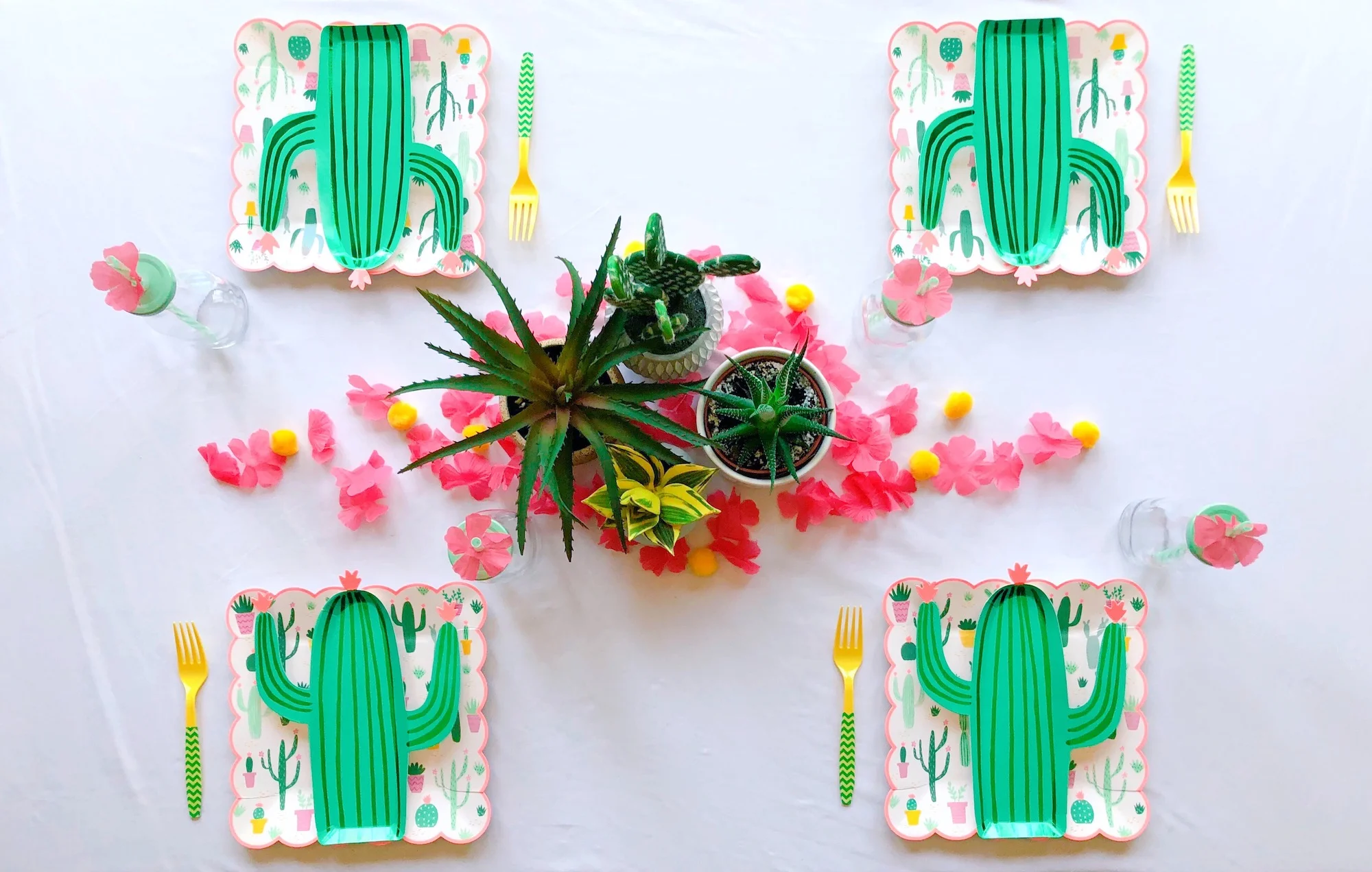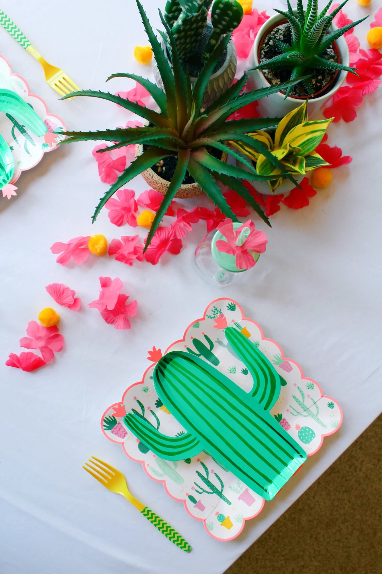 These Meri Meri cactus/succulent plates inspired the whole party! Plate layering is always a good idea, and I used yellow forks and pom poms to help bring out the yellow planter pots on the larger plate and add another color to the very green and pink scheme that accompanies so many cactus-themed parties.