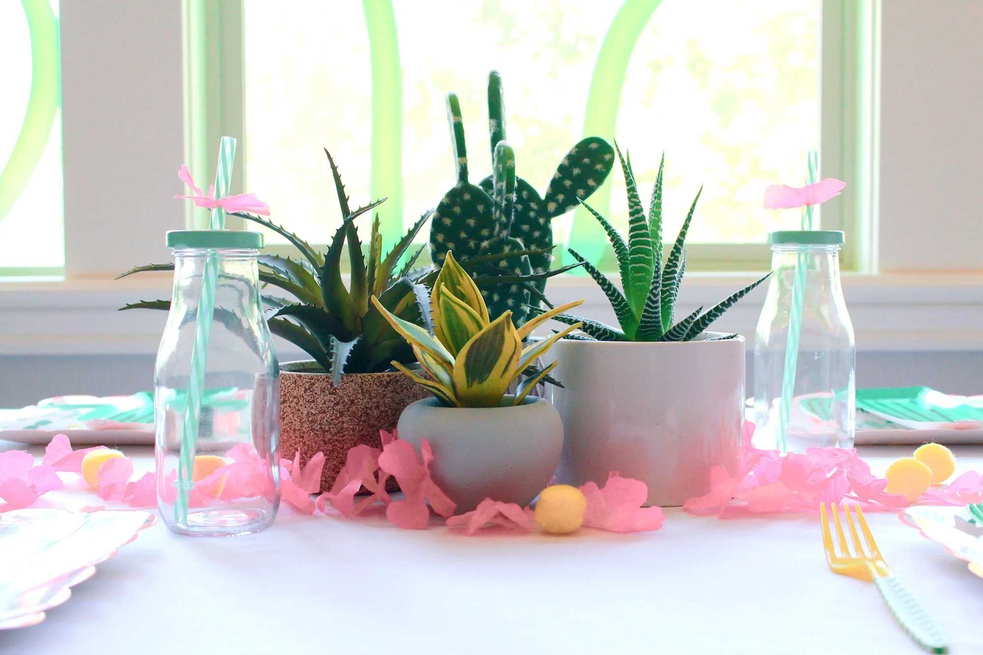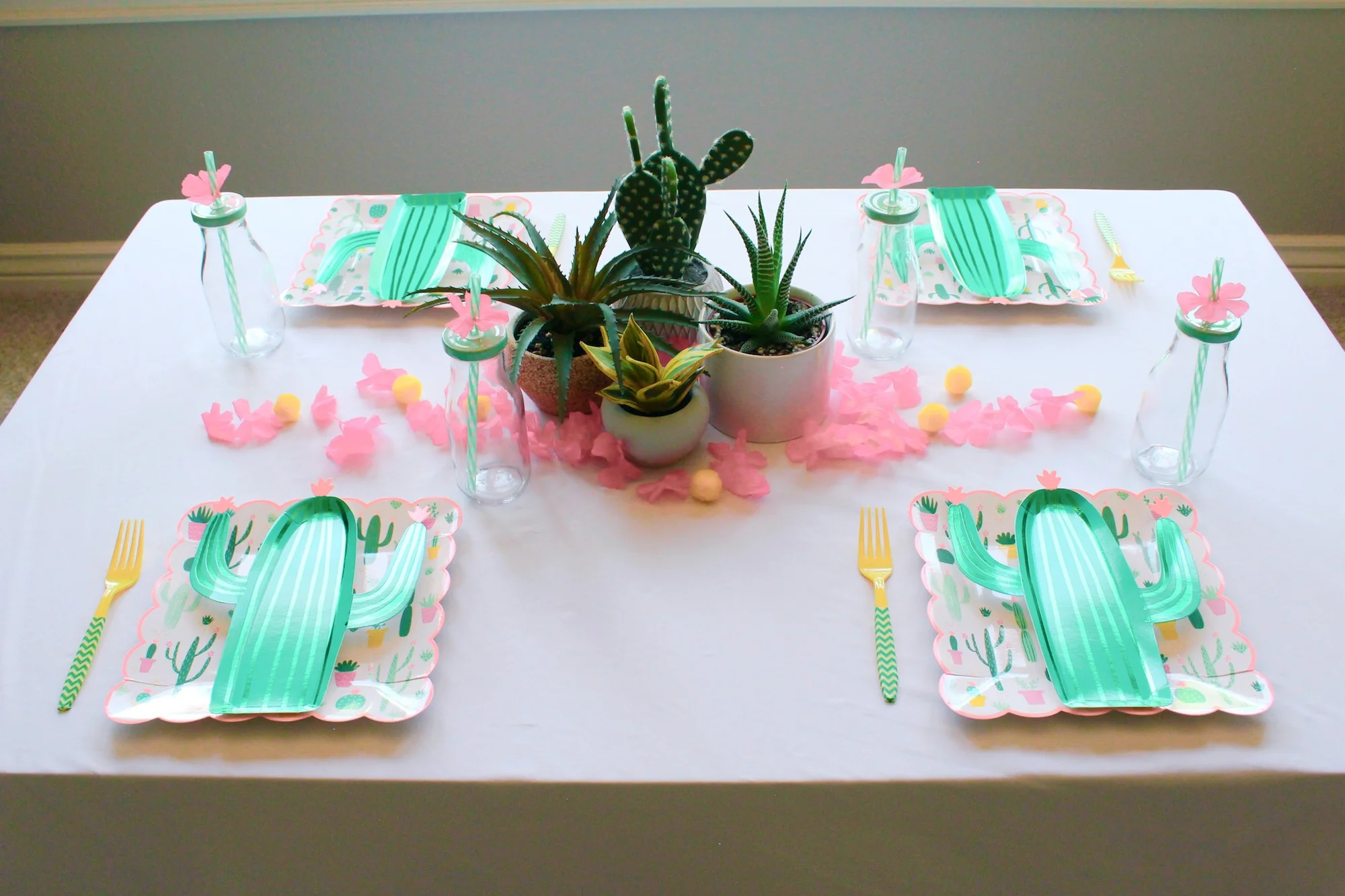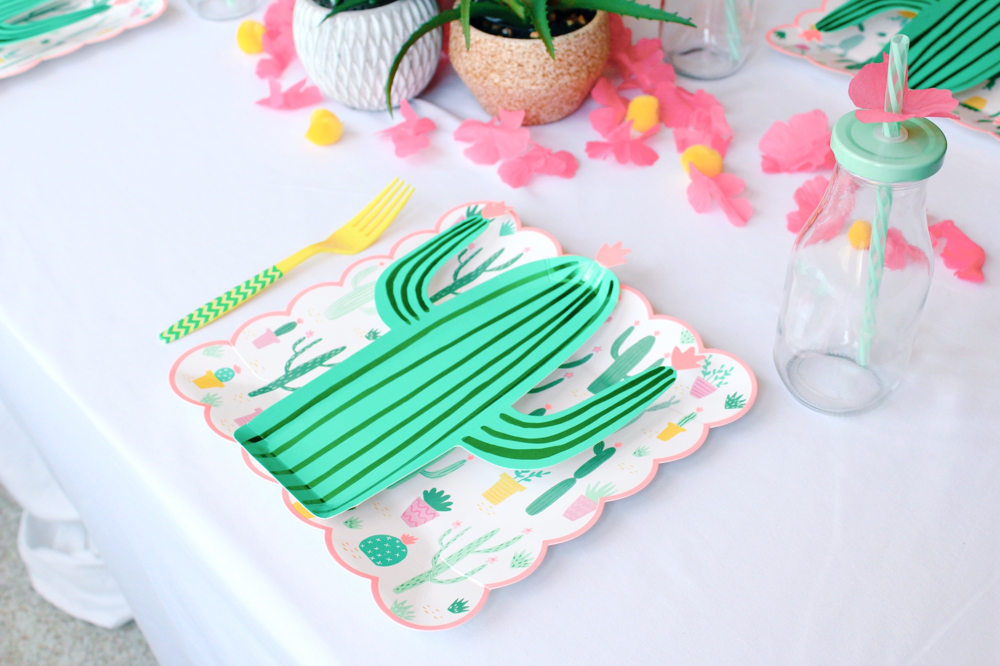 These Meri Meri cactus/succulent plates inspired the whole party! Plate layering is always a good idea, and I used yellow forks and pom poms to help bring out the yellow planter pots on the larger plate and add another color to the very green and pink scheme that accompanies so many cactus-themed parties.