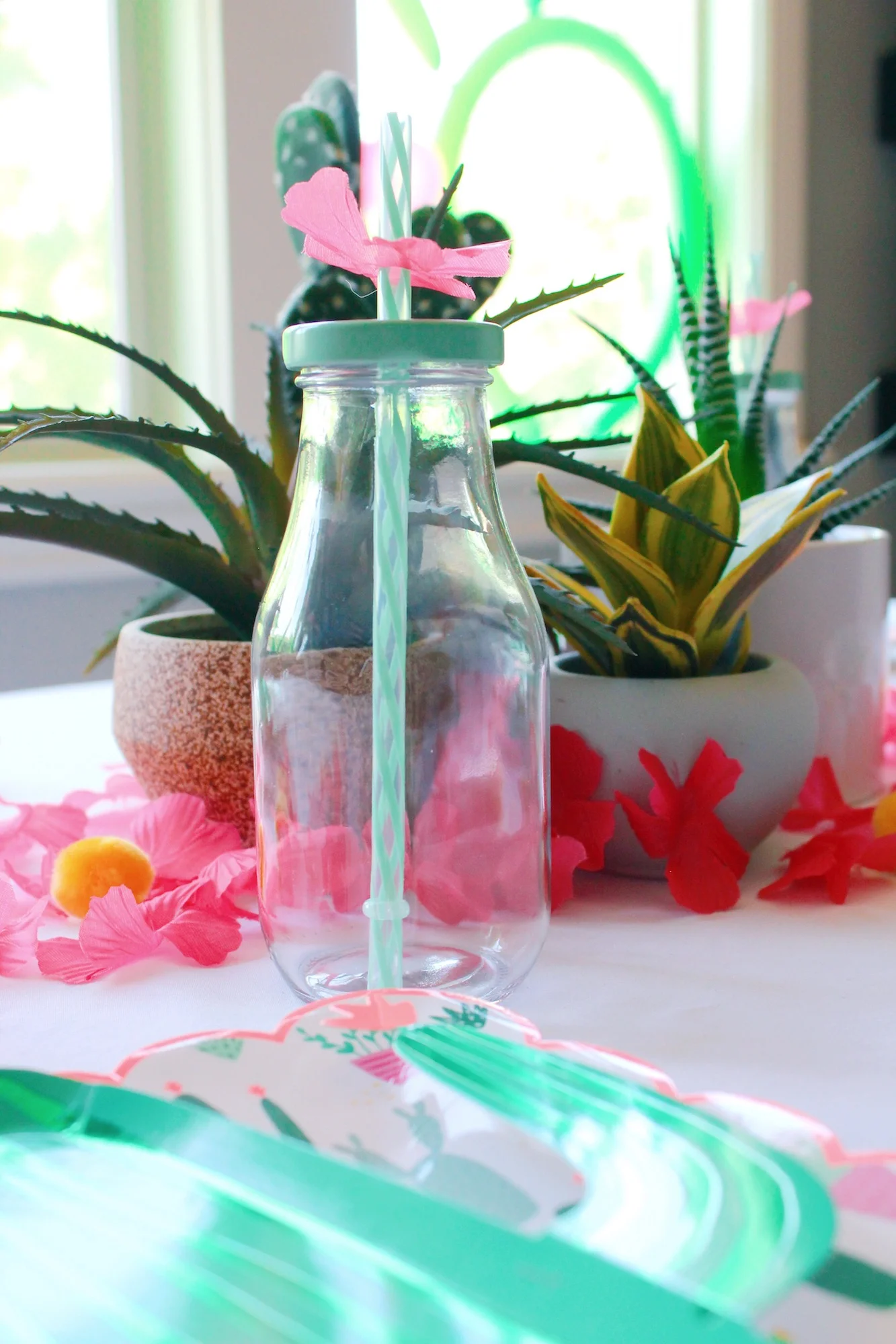 I added another dimension to the green straws by taking apart a lei and making individual flowers into our own little cactus blossoms. The rest of the lei went to table confetti!